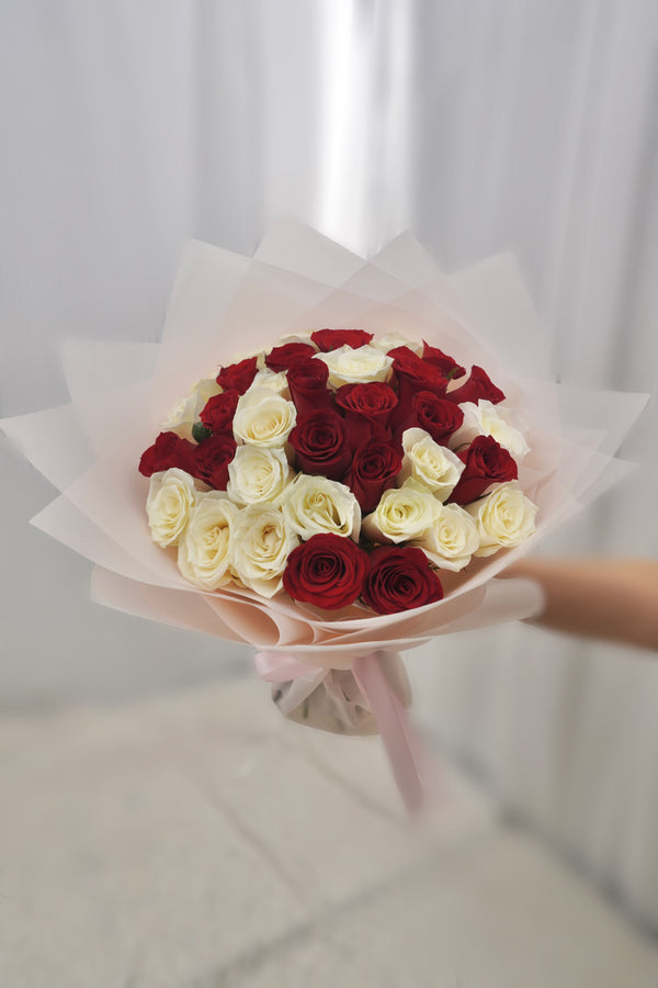 This French-style bouquet features elegant white lychee-scented roses wrapped in sophisticated black packaging, exuding an air of elegance and classic charm. Each lychee rose releases a captivating fragrance, enchanting all who encounter it, as if immersed in a dreamy floral paradise. The black packaging adds a touch of mystery, enhancing the bouquet's nobility and sophistication, making it suitable for any occasion. Whether for a birthday, anniversary, or a special date, this bouquet is the perfect choice for conveying love and blessings, sure to leave the recipient feeling warm and pleasantly surprised.
